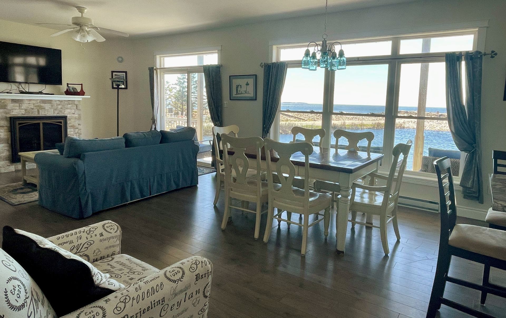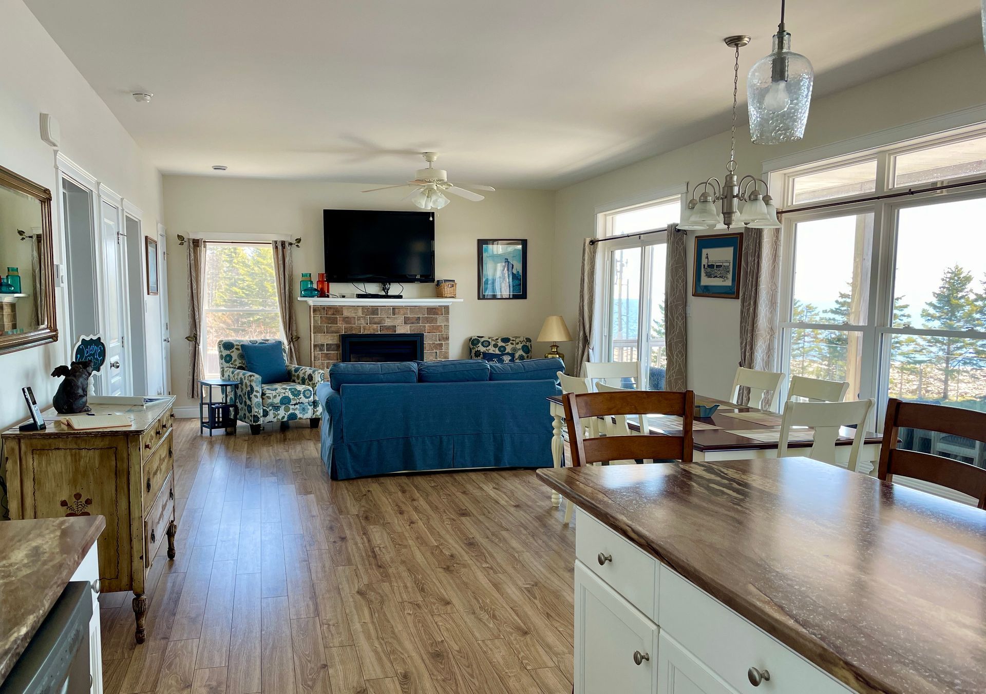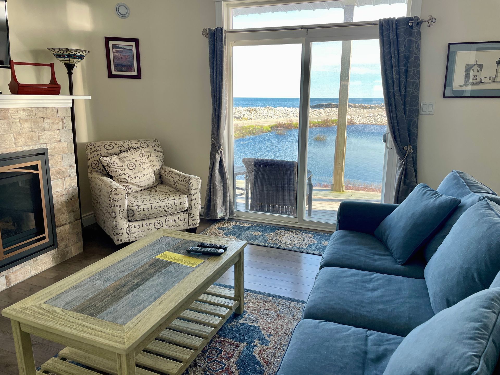 Tidepool is one of three TideWatch Ocean Suites located on the Quietside of Mount Desert Island in the town of Southwest Harbor. Just steps away from the Atlantic Ocean, the property borders the Seawall Entrance to Acadia National Park and adjoins a pine forest and a freshwater pond which provides ample opportunities for bird watching and scenic photography. Tidepool is located on the first floor of the TideWatch Suites. This unit is ADA compliant with a ramp going up to the entrance, a walk-in shower, and lower beds. TidePool can sleep up to 6 individuals with a king bedroom suite with an attached bathroom, a queen bedroom, and a full-size sleeper sofa in the living room. The unit also has a second centralized bathroom with a walk-in shower, a fully equipped kitchen, a gas fireplace, and a unit-length deck, (complete with grill and outdoor seating), to enjoy the breathtaking view.